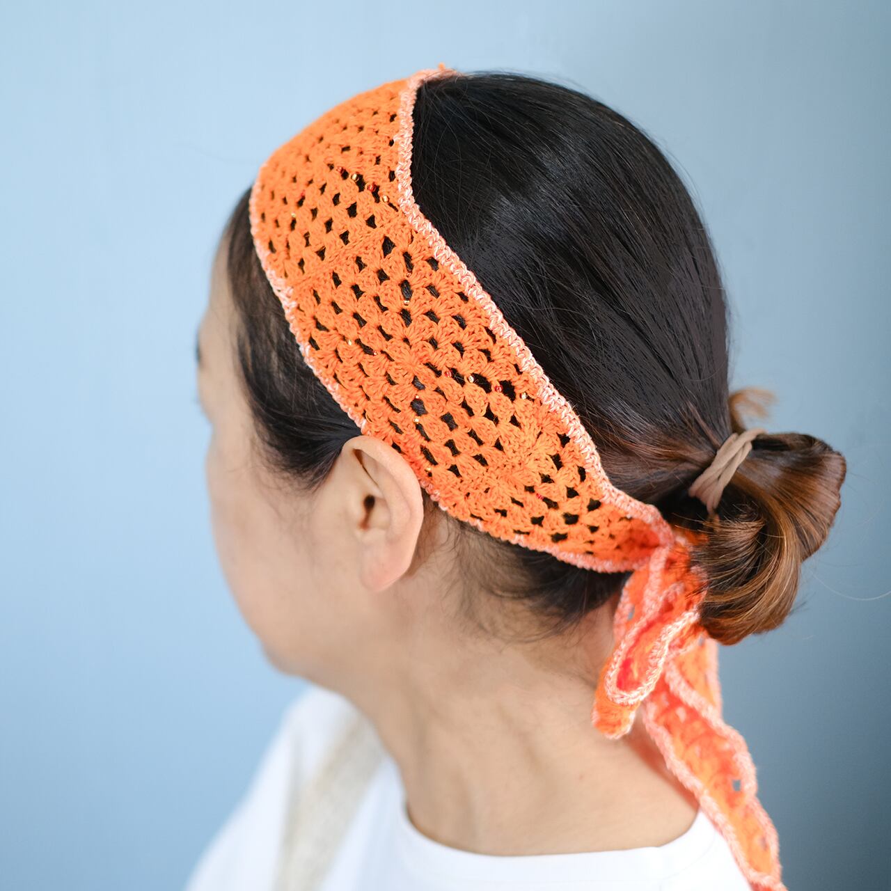 透け感のある編み模様にビーズを編み込んだ、軽やかポップな印象のヘアバンド。