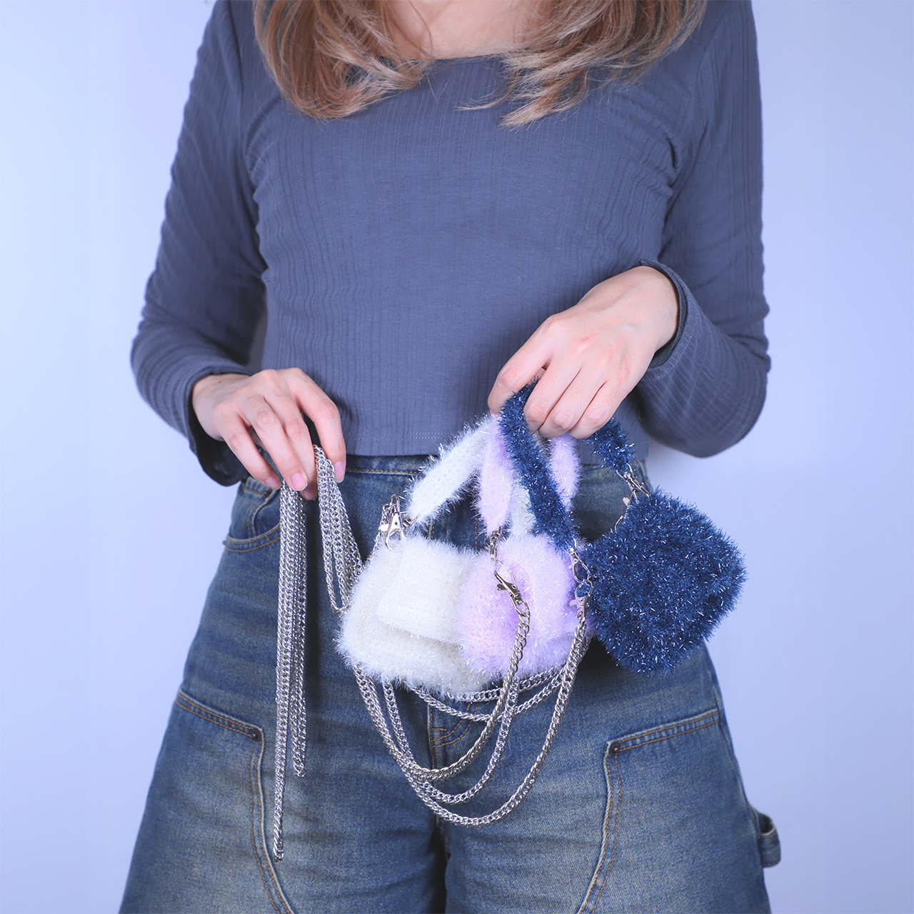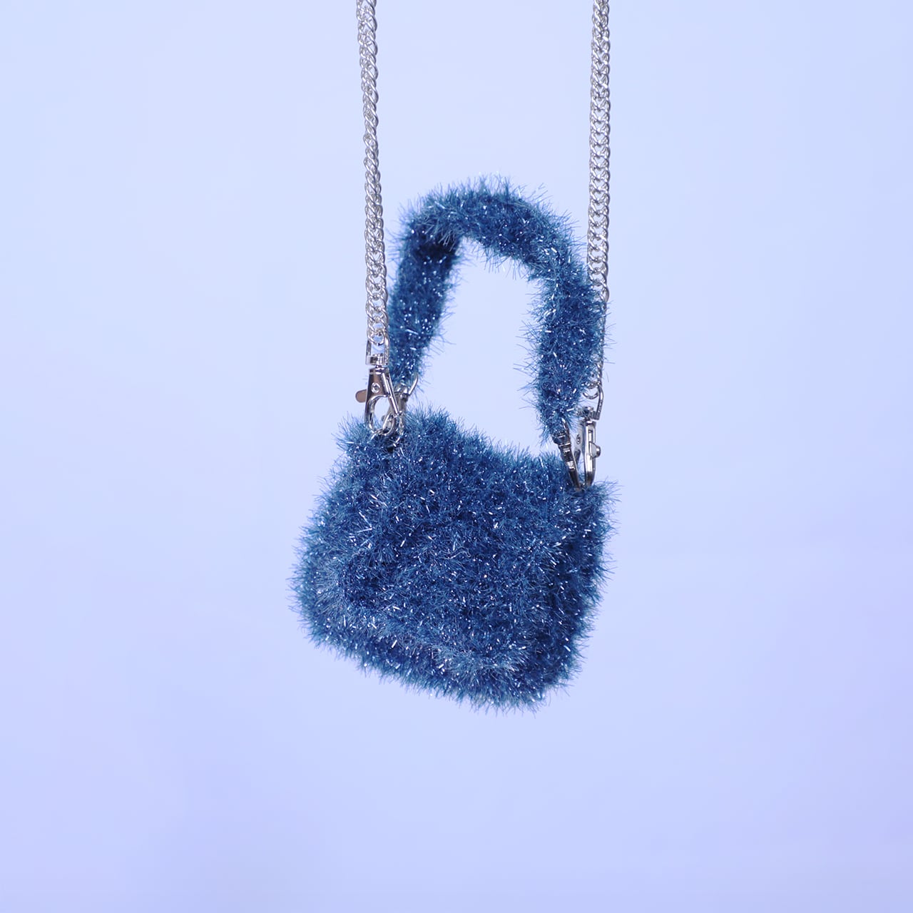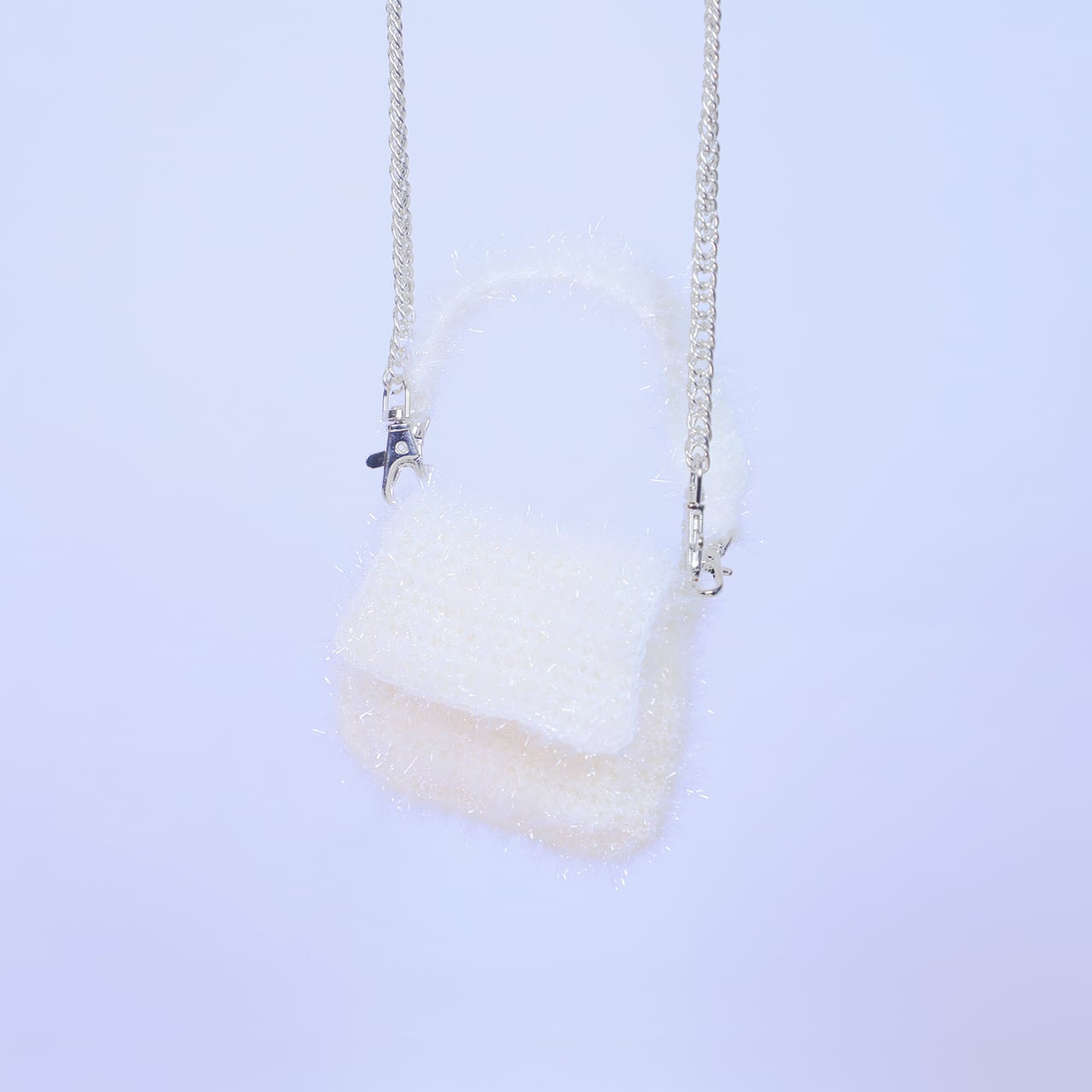 キラキラと光る糸で、小さなハンドバッグ型に編み上げました。